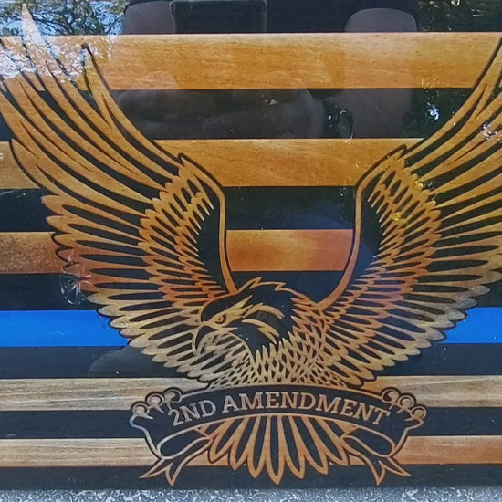 This blue line wood flag is a perfect gift for your law enforcement professional. Custom laser engraved wood flag overall dimensions is 24" wide x11 1/4" tall x 3/4" thick. This custom engraved flag is personalized with name, dates, and police badge or patch. Perfect for that current law enforcement professional, retired law enforcement, or as a memorial.